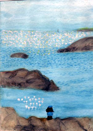 | "Matkan pää yllättää! Senhän tahdoitte kuulla. Ottakaa tai hyljätkää. Näin huudan varmalla suulla. Siellä auringon loistaessa on varmaan meren väkeä. Nyt salasanoja toistaessa kuljen orpona täällä mäkeä. Olis sätkintä Aallottarelle, kukkia kaunottarelle!" |