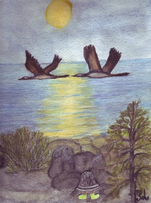 Sen huuto ja äkäily kuului kauas merelle ja se sai pari uteliasta kurkea kiinnostumaan itsestään. Ne lensivät ylväästi vedenrajassa ja huusivat Kääpäselle kiukkuisesti.