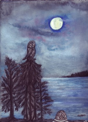 Lämpimien päivien illat olivat tyyniä ja kuutamoisia. Eräänä iltana Kääpänen kuuli päänsä yläpuolelta outoa henkäilyä. "Huh huh huu huh huuuuuuuu"joku huuteli. "Hu huuuuuuu itsellesi!" vastasi kääpäpää kiukkuisesti. Se ei enää jaksanut mitää outoa ja kummallista lisää. Se ei tiennyt, että ääni ylhäällä tuli saaren linnuista viisaimmalta, pöllöltä. " Sinä kuulemma saisit apua itseltään ilmojen valtiaalta, merikotkalta!" pöllö möläytti ilmoille. "Se siivinliikkuja saa kyllä varmasti tuommoisen käävän irtoamaan. Sinun pitää nyt vain antaa sen tehdä niin." "Mitä emmit? Ei mitään saa se ken aristaa! Riskejä pitää elämässä ottaa!"