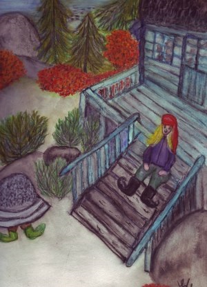 Nyt oli uskallettava jo mennä suoraan haltian eteen, jotta tulisi nähdyksi ja kuulluksi.Kääpänen hyppäsikin rohkeasti saunatontun katsannolle saunan rappusten luona.