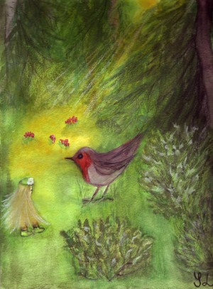 Nyt oli maahinen vapaa käävästään! Sen omassa hatussa loisteli täysin toimintakykyisenä kaikkien maahisten salainen ase, muuttumiskivi.Sitä voisi siis käyttää ja painua maan alle omiensa luo. Mutta sitä maahinen ei voinut tehdä ennenkuin se oli nähnyt punarinnan. Kiukuttelut oli pyydettävä anteeksi ja kiitettävääkin punarinnalle oli. Maahinen saikin houkuteltua tuon pienen sanansaattajalinnun esiin kuusten oksistosta aurinkoiselle metsämättäälle. " Anteeksi anna ennakkoluuloni, kiukutteluni,omituiset oikutteluni,hädissäni häikäilyni!" " Kiitos kun minut huomasit, lähelleni tulit!"