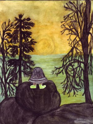 "Taivaaltako apua?!" Kääpänen hyppi ja huusi rantakivellä.