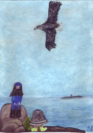 Saaren ukko istui rantakalliolla ja huuteli Kääpäsen luokseen. Arkana Kääpänen meni rantaan ja niin siinä kävi, että meritaivaan valtias , merikotka suhahti paikalle. Kotka oli ylpeän oloinen ja Kääpänen alkoi pelätä sitä. Ei tuntunut ollenkaan kivalta joutua noin julman näköisen ison linnun hoiviin. Ja eihän maahinen muutenkaan voinut ilmojen eläjiin luottaa. Kaikki jo maan päälläkin asujat oli sille arvaamattomia,saatikka sitten taivaalla lentävät! Kääpänen ei sanonut mitään ja jätti asian sikseen. "Hatusta pitäisi päästä eroon, voi minua!"
