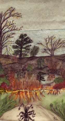 Ja kävi niin, että muurahaiseksihan semmoisella porinalla muututtiin. Taikakivi vaan takaisin paikoilleen ja ei kun matkaan! Ja maahiskuopus kiipesi kiveä pitkin ulospäin kotikolostaan. Se oli semmoinen pilvinen aamu, joita usein syksyllä saaressa on. Paljon oli harmaansinistä kaikkialla. Valoa ei ollutkaan niin paljon kuin kuopus luuli näkevänsä. Jotain loistavapintaista oli lähellä ja etenkin kaukana. Kuopus näki ensimmäistä kertaa elämässään merta ja kalliolampia sekä ääretöntä taivasta. Vau , olipa erilaista kuin maan alla!