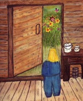 Niinpä nousi maahiskuopus ja käveli ulko-ovelle asti toivoen jotain keksivänsä. Ei muuta kuin ovi auki ulos ja hän katsoi isompien kulkemaa reittiä. Sepä kannattikin tehdä! Ovenpielessä loistivat muiden maahisten muuttumiskivet kuin kauniit kukkaset marjavarpujen päissä! Isommat maahiset olivat tehneet rohkean tempun, jättäneet hatuistaan kivet kotiportille muurahaisinakulkuretkensä ajaksi. Eivät halunneet erottua muista saaren muurahaisista ja ajattelivat taas kotiin tullessaan ottavansa kivet siitä, kun halusivat muuttua maan alle maahisiksi. Tässäkö olisi kuopuksella oiva mahdollisuus.....