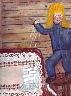 Kiukkuisena ei kannattaisi tehdä mitään varovaisuutta vaativaa! Sen sai Maahiskuopus karvaasti kokea, kun se päätti lohduttaa itseään ottamalla kaapin päältä kauniin maljakon käsiinsä. Tätäkään esinettä ei hän ole koskaan saanut pidellä. Nyt oli siis tehtävä tämäkin! Ja vauhdilla.Ei muuta kuin jakkaran päälle ja maljakkoa ottamaan. Mutta, kun on kiukkuinen ja innosta jäykkänä, ei asiat suju niinkuin pitäisi. Maljakko lipesi kuopuksen kädestä ja putosi pöydän pitsiliinalle. Eikä siinä kaikki! Pudotessaan maljakko meni myös rikki.Siitä irtosi patsaasta pojan jalka ja linnun pää. Näin kuopus ei olisi halunnut käyvän. Nyt kaikki saavat tietä, mitä hä on tehnyt!