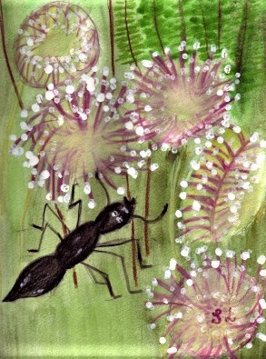 Maahismuurahainen kulki niin riemuissaan valoa kohti, että se luuli maassa olevan kiiltelynkin turvalliseksi. Sen jalka tuntui tarttuvan johonkin tahmeaan. Onneksi se ymmärsi heti vetää itsensä pois tästä liimasta. Ei tiennyt pieni kotiinkulkija muurahaisia pyydystävästä kasvista yhtää mitään. Se ei onneksi jäänyt kiinni kurjan lihansyöjäkasvin ansaan vaan pääsi jatkamaan matkaansa.