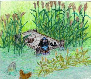 Näkkiä. Puhuttelen kalaa, nyt tapahtuisko äkkiä! Kertois Näkki tämä kerta. Onko väärin, kun en näe merta?" "Voi sinua rukkaa, miksi järvi ei riitä?" "Näen jo Näkin tukkaa, kysyisin itseltään mä siitä! Täällä onhan näkinkengät laiturilla, mutta Näkki se vaan pysyy piilosilla." |