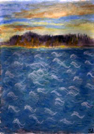 Syystuulessa meri paukkasi. Tulivat hevot Ahdin. Ne saaren ympäri laukkasi ja tuuli määräsi tahdin. Näin oltiin kuin yhtä firmaa, kudottiin ystävyysloimet. Meressä hevot kirmaa, saaressa rauhan toimet. Nyt loppui riitaisa jahti. Ei ollut haltia yksin. Vaan Kammo, Tapio ja Ahti hänen kanssaan käsityksin.