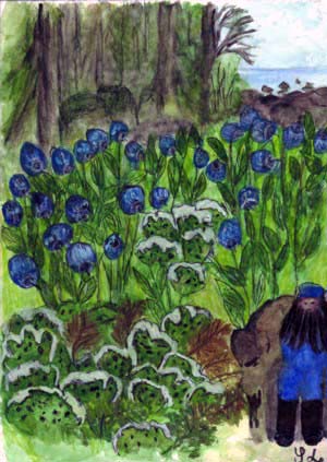 | "Nyt kasvakaa te hienot jäkälät! Olkaa metsänteon suojakilvet. Ei tallaa teitä pahan käpälät. On suojananne taivaan pilvet. Olette kuin lapa lapion. Loistaa pinnassanne pilkut. Innostatte saareen Tapion, maata peitätte kuin tilkut. Hoi, mahtavaa jäkälää, marjaa hohtavaa!"