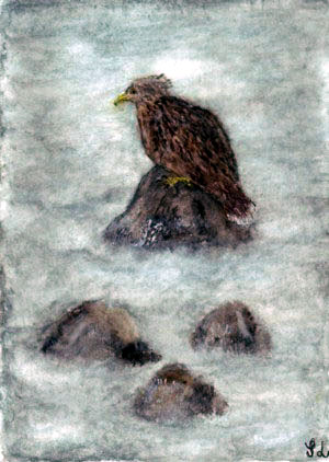 | Oli olot semmoiset täällä, että istui kotkakin kivellä. Ja harmaalla myrskysäällä sen näki pyynnillä. Kaikkea pitää sallia. Kaikille paikkansa löytyy. Tästä ottakoot muutkin mallia, yhteiselosta hyötyy. Ilman mitään mutkia tarvitaan myäs kotkia.