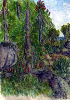 | " Nyt ei ehdi pehkuun, kuusten täytyy näkyä! Laitan oksat hehkuun, jotta saadaan käpyä. Näin aivan lähellä rantaa kasvaa kunnon kuusia, punakynttiläitä kantaa ja siemeniä uusia. Kun saaressa kuuset kukkii, on silloin varmasti kesä!"