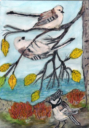 | " Ti-Ti-Ti täällähän virkistyy! On saarenne Tapion suojassa. Sehän se onkin ilon syy, kun turva on kasvun tuojassa." " Haltia sammaleet somisti. Jäkälällä ne komisti." Pysähtyivät puihin pyrstökkäät, kaikesta ilahtuivat. Oksilla tirskuivat siivekkäät, kasveista riemastuivat.
