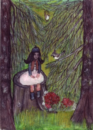 Tyttöhaltia istui kannon päässä ja oli tyytyväinen, kun oli saanut vastarannan pienen tytön iloiseksi. Ei mennyt kauaakaan, kun siihen tuli kaksi lintua. "Sinä se ihmisiä tarkkailet! Oletko huomannut mitä saaren haltioille kuuluu?", töyhtötiainen ja hippiäinen tirskuttivat. " Käy saaren vanhalla saunalla!" Oliko sielläkin joku?