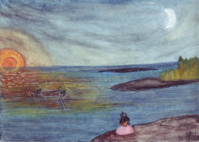 Ainakin pariskunnan miehelle oli tärkeää saada kalaa merestä. Hyvä saalis sai hänet ylen tyytyväiseksi. Yhdessä mies ja vaimo virittelivät ansoja kaloille. Verkkojen lasku iltahetkenä, kuun ja auringon katseessa, olikin tyttöhaltialle oiva tarkkailunkohde. OLIKO RÄISKYVÄ TILANNEMETELI ONNEA!